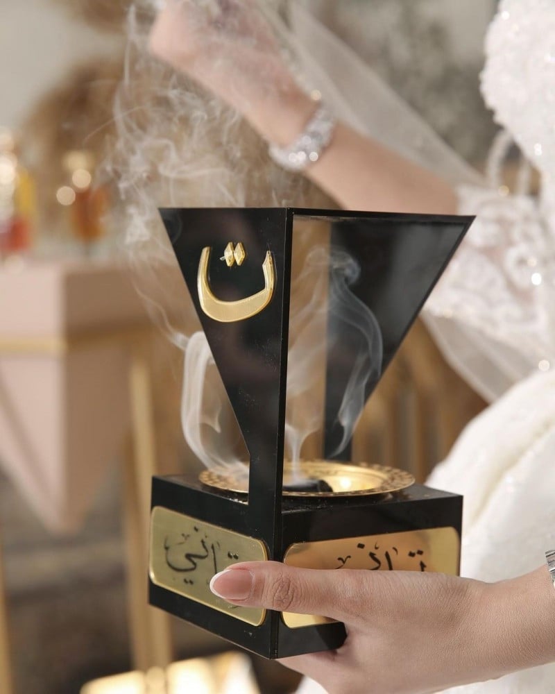 مبخرة مودرنتأتي بتصميم حديث يتميز ب الفخامة و الأناقةمصنوعة من الأكريلك الأسود اللامع.يتم وضع الاسم و الحرف المطلوب من الأكريليك الذهبي او الفضي .
